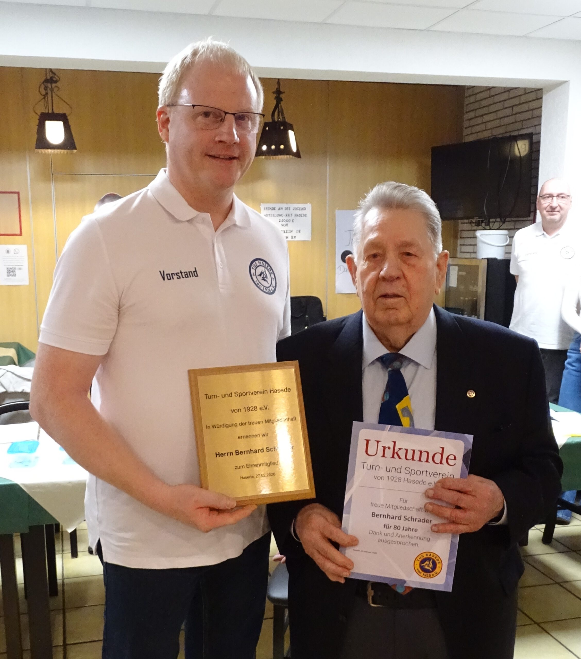 Eine besondere Ehrung wurde Bernhard Schrader zuteil, der für 80 Jahre im TuS Hasede ausgezeichnet wurde. Geb. 1935 in Sarstedt, kam er bereits nach einem Jahr nach Hasede, ging dort zur Schule und begann danach eine Lehre bei Voss in Sarstedt, ehe er die letzten 20 Jahre seines Berufslebens als Lockführer bei der Deutschen Bahn tätig war. Hier steuerte er sogar noch eine alte Dampflock.